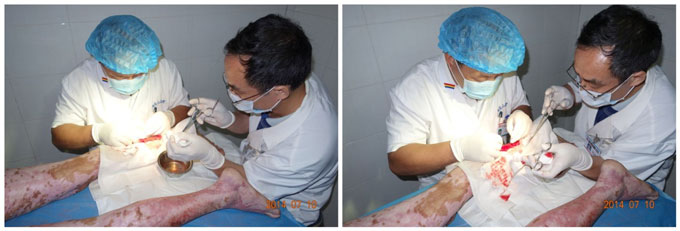 培訓(xùn)結(jié)束后,趙瑞慶教授針對(duì)運(yùn)動(dòng)醫(yī)學(xué)科等科室醫(yī)務(wù)人員提出的臨床問題,分別作了新鮮傷口正確使用創(chuàng)瘍貼、早期防治疤痕的耐心解答。趙瑞慶還在燒傷整形科,為鐵水燒傷的病人李某某做了殘余肉芽創(chuàng)面皮簇種植術(shù)的示范操作演示。煙臺(tái)山醫(yī)院本次培訓(xùn)手術(shù)演示,對(duì)該院開展多科室使用燒傷創(chuàng)瘍?cè)偕t(yī)學(xué)與療法起到了很好的推動(dòng)作用。