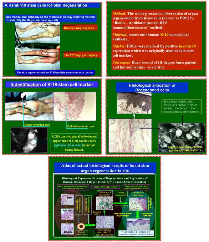 美國從脂肪組織中獲取干細(xì)胞的技術(shù)利用的就是我們的思路。凡是利用這種思路研究的結(jié)果,就都屬于我們中國人的發(fā)明,因為我們擁有這項技術(shù)的專利權(quán),他們的研究是在看了我們的研究思路后才完成的。這就又形成一個定律:既然皮膚組織中能找出干細(xì)胞,那其他組織器官中也都能找出干細(xì)胞。而從器官組織中找到的干細(xì)胞的前身細(xì)胞是誰?這是這項科學(xué)體系的關(guān)鍵。在燒傷創(chuàng)面的研究中,我們確認(rèn)干細(xì)胞來源于原位的組織細(xì)胞,我們早已將其命名為“潛能再生細(xì)胞”,這是人體各器官、組織先天存在的再生潛能,所以形成了皮膚具有再生潛能,人體各器官、組織都具有再生潛能的再生定律。