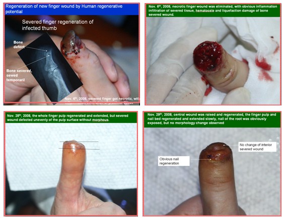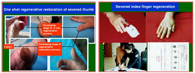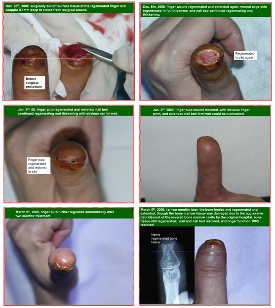 這是一個因外傷而斷指的患者6d~7d的創(chuàng)面。該指體離斷以后在醫(yī)院進(jìn)行了再植連接手術(shù),但沒有成活。而后來我們這里實(shí)施了原位再生復(fù)原斷指治療技術(shù),因為是感染的創(chuàng)面,在22天時,創(chuàng)面就提前封閉了,但指體沒有完全再生復(fù)原,缺少了一段。怎么辦?由于我們按照生命定律確認(rèn)所有器官里都有再生生命,重新再生的手指指體里仍然繼承了人體再生潛能的結(jié)構(gòu),我們相信這個斷指還能再生,所以我們重新截掉部分新再生的指體,形成新鮮的創(chuàng)面,再重新原位培養(yǎng)指體斷面,最后指體原位再生復(fù)原了。人體是由上皮組織、結(jié)締組織、肌肉組織、神經(jīng)組織這四大組織組成,現(xiàn)在含有這四大組織的斷指再生修復(fù)了,堅信人體組織完全可實(shí)現(xiàn)原位再生復(fù)原。以上病例驗證了人體又表達(dá)出了新的再生生命定律。