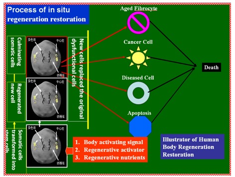 人在30歲以前,各器官、組織中的細(xì)胞維持在平衡狀態(tài),器官功能強(qiáng)壯,細(xì)胞功能旺盛,人體“基本生命”強(qiáng)盛。過了30歲,則人體器官和組織中的細(xì)胞開始出現(xiàn)相對平衡,細(xì)胞開始衰老,出現(xiàn)了正常生長的細(xì)胞、少量衰老的細(xì)胞與死亡細(xì)胞之間的相對平衡維持,器官功能正常,細(xì)胞功能相對旺盛,人體“基本生命”相對旺盛。人超過了40歲,衰老的細(xì)胞開始增多,衰老狀態(tài)細(xì)胞與生長狀態(tài)細(xì)胞幾乎處于相同的比例狀態(tài),此時尚且還能夠維持這種生長與衰老細(xì)胞及死亡細(xì)胞在數(shù)量上的平衡狀態(tài),但器官功能已經(jīng)開始下降,細(xì)胞功能也開始出現(xiàn)減退,人體“基本生命”開始出現(xiàn)衰弱表現(xiàn)。當(dāng)人超過了50歲,正常生長細(xì)胞越來越少,衰老細(xì)胞越來越多,人體衰老細(xì)胞的數(shù)目已經(jīng)超過了正常生長的細(xì)胞數(shù)目,此時衰老的細(xì)胞占了多數(shù),平衡狀態(tài)就被打破,并隨著年齡增長,人體細(xì)胞開始出現(xiàn)纖維化、疾病、異變及凋亡等現(xiàn)象,器官開始出現(xiàn)退行性改變,器官功能進(jìn)一步下降,細(xì)胞功能進(jìn)一步低下,人體“基本生命”也更加衰弱,當(dāng)這些細(xì)胞達(dá)到一定數(shù)量時,會導(dǎo)致器官功能喪失,進(jìn)而人體死亡狀態(tài),人體“基本生命”終止。但如果啟動人體潛能生命體的功能,人體一旦進(jìn)入再生復(fù)原后,上述“基本生命”的規(guī)律將發(fā)生改變,再生復(fù)原可以使人體“基本生命”得到保障和加強(qiáng),人體“基本生命”可以重新保持旺盛的生命活力。