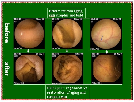 某會員,42歲,胃腸道衰老非常嚴(yán)重。養(yǎng)生前膠囊胃鏡表現(xiàn):小腸粘膜和粘膜下層明顯萎縮,變薄,粘膜下血管網(wǎng)及血管袢清晰可見,絨毛稀疏、增寬而短、斷裂、退化、部分區(qū)域絨毛脫落甚至脫失,隱窩深度變淺。整個胃腸黏膜系統(tǒng)呈現(xiàn)衰老狀態(tài)。養(yǎng)生一年后膠囊胃鏡表現(xiàn):小腸粘膜和粘膜下層明顯增厚,看不到粘膜下血管網(wǎng)及血管袢,絨毛濃密、長度增加,直徑增粗,沒有明顯斷裂、脫落、脫失的絨毛粘膜,隱窩變深。整個胃腸黏膜系統(tǒng)完全呈現(xiàn)為年輕健康的狀態(tài)。這個結(jié)果是當(dāng)前生命科學(xué)前沿所不能達(dá)到的。器官移植雖然可以,但移植本身是有缺陷的。