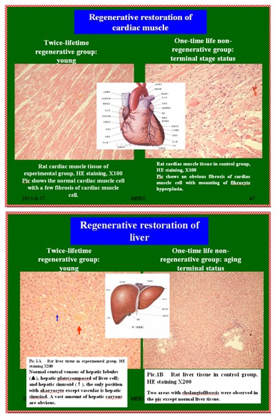 試驗證明,大白鼠實(shí)現(xiàn)了2倍年齡不衰老,人體就能實(shí)現(xiàn)2倍年齡不衰老。我們對每個器官都進(jìn)行驗證。試驗結(jié)果:用300天雄性大白鼠,相當(dāng)于人類60歲,一組加再生物質(zhì)喂養(yǎng),一組不加再生物質(zhì)喂養(yǎng)。沒有加再生物質(zhì)喂養(yǎng)的老鼠,在一倍壽命(平均480天)時就衰老死亡了,器官組織學(xué)檢查確認(rèn)各器官都衰老于中年。而加入再生物質(zhì)喂養(yǎng)的老鼠活到兩倍壽命時還都活著,通過器官組織學(xué)檢查,各個器官都處于年輕狀態(tài)。目前,冠心病、腎臟,肺纖維化等疾病通過再生復(fù)原醫(yī)療技術(shù),按照人體再生生命定律,器官衰老難題都已經(jīng)解決了。