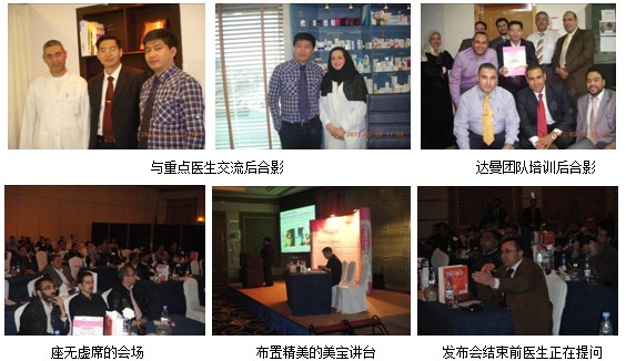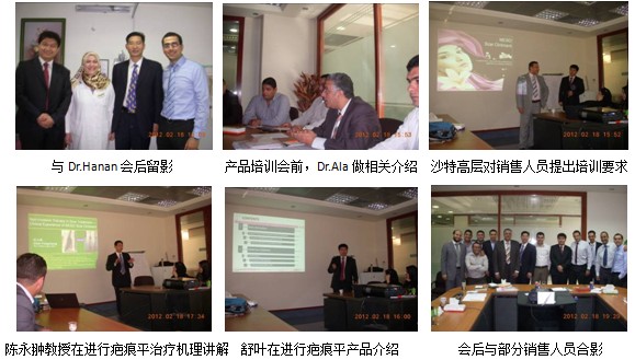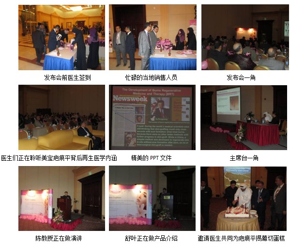 自2011年疤痕平軟膏在中東地區(qū)數(shù)個國家拿下CPP(Certificate of Pharmaceutical Product)藥品證書之后,美寶疤痕平已正式以藥品身份進入醫(yī)院銷售渠道。在美寶國際市場集團及其合作伙伴海灣Julphar藥廠積極的組織安排下,分別在沙特三大城市吉達、達曼、利雅得成功舉辦產品發(fā)布會,共計有來自各市醫(yī)療機構的440名臨床醫(yī)護人員參加了產品發(fā)布會。其間,訪問了當?shù)刂攸c醫(yī)生13名,會診病例5名,直接培訓當?shù)匾痪€銷售人員25名。培訓團隊由來自中國燒傷創(chuàng)瘍科技中心臨床部主任、北京榮祥再生醫(yī)學研究所副所長、北京中西醫(yī)結合學會燒傷專業(yè)委員會副主任委員、中國燒傷創(chuàng)瘍雜志社副社長的陳永翀教授及美寶國際集團產品部主管舒葉組成。培訓內容包括疤痕治療選擇、疤痕形成原因、疤痕平組成成分、再生醫(yī)學-抗疤痕機理、疤痕平臨床使用方法、美寶疤痕平聯(lián)合無創(chuàng)或有創(chuàng)方法治療各種疤痕的典型病例介紹等。具體情況報道如下: