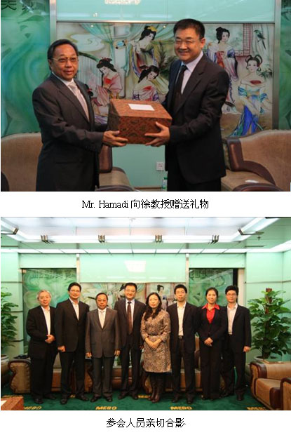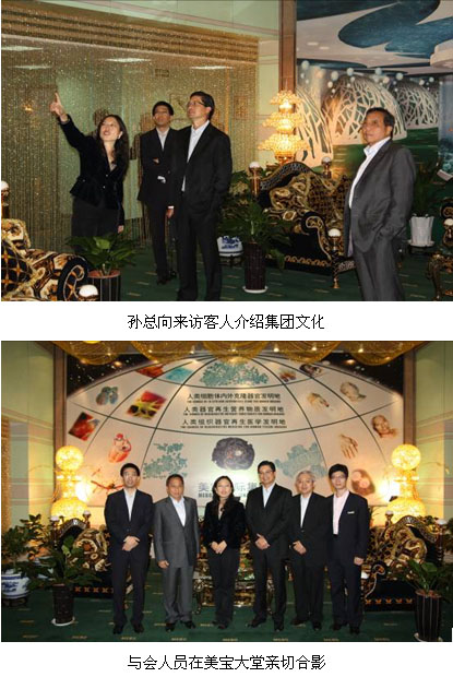 10月22日上午,美寶國際集團(tuán)董事局主席徐榮祥教授在集團(tuán)貴賓室親切會見Mr. Hamadi一行將本次訪問活動推向了高潮。徐教授表示美寶印尼市場一直以來都是美寶集團(tuán)最為關(guān)注的市場區(qū)域之一,對雙方所達(dá)成的五年規(guī)劃、新產(chǎn)品發(fā)展計(jì)劃及新的合作模式表示祝賀,并向客人全面通報了近年來美寶在癌癥研究及再生會所等方面取得的重大進(jìn)展,并提出印尼將是美寶人體再生復(fù)原俱樂部全球推廣計(jì)劃的基地之一。Mr. Hamadi首先對于徐教授的介紹表示感謝,對于美寶在癌癥研究方面取得的成就表示祝賀,同時對于徐教授提出的計(jì)劃連聲表示贊同,希望回到印尼后能夠盡快啟動這項(xiàng)計(jì)劃,希望自己盡快在印尼享受到人體再生復(fù)原技術(shù)帶來的養(yǎng)生效果。