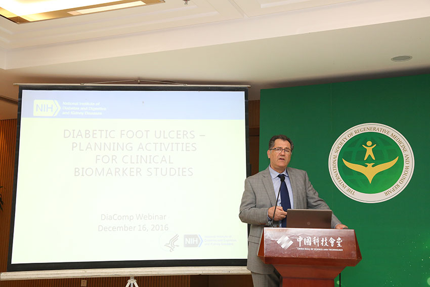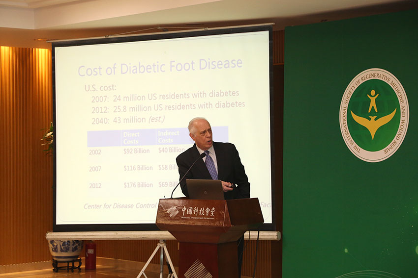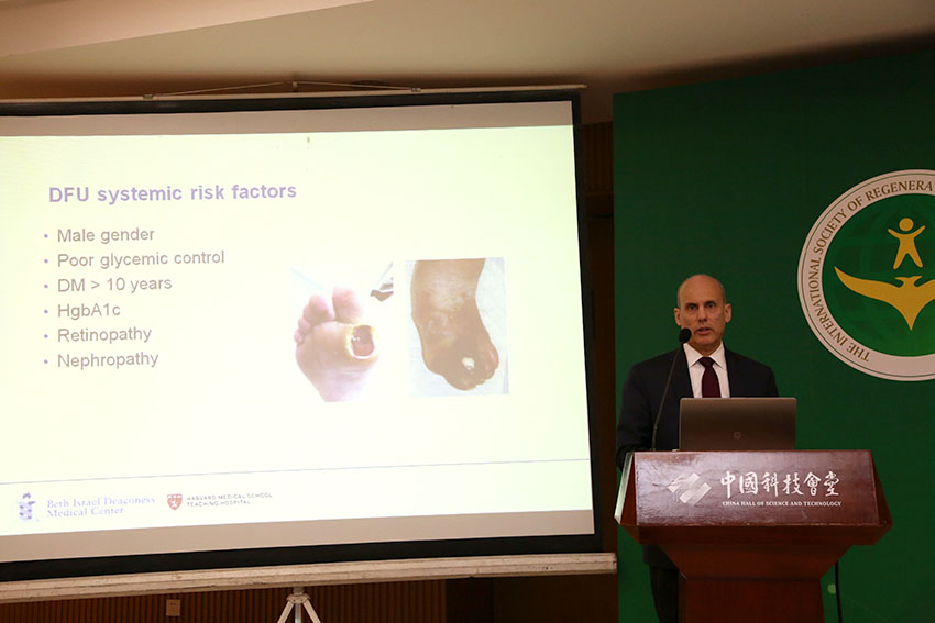 來自各醫(yī)學(xué)專家教授圍繞再生醫(yī)學(xué)與創(chuàng)面修復(fù)分別發(fā)表了重要學(xué)術(shù)演講。哈佛醫(yī)學(xué)院外科副教授、BIDMC足病科主任約翰·吉里尼博士在大會(huì)上向現(xiàn)場來賓陳述了糖尿病潰瘍發(fā)病過程及如何治療,重點(diǎn)剖析了足部潰瘍的原因并從病理學(xué)和微生物學(xué)檢查等方面講解了應(yīng)對及預(yù)防的措施和治療效果,從而降低截肢率。