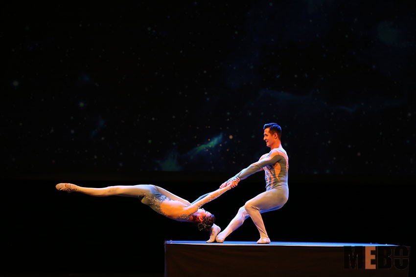 著名雜技藝術(shù)表演者李夢楠、徐朝鋒雙人超高柔術(shù)《靈》將身體的柔韌演繹到了極致。