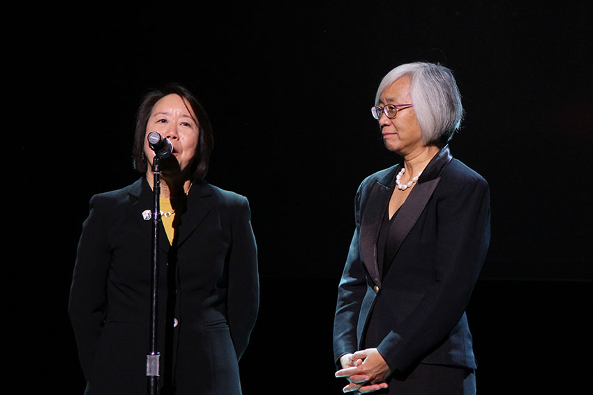 加州州立大學(xué)洛杉磯分校學(xué)生事務(wù)副主席Nancy Wada-McKee(左)致詞,對來訪的各界朋友表示歡迎,希望來賓們共同享受這場集合多種中國傳統(tǒng)藝術(shù)的精彩文化大餐。