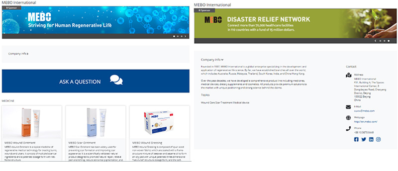 美寶國(guó)際精心設(shè)計(jì)的在線展臺(tái),力求從多方面向與會(huì)者展示企業(yè)風(fēng)采。在產(chǎn)品方面,不僅展示了濕潤(rùn)燒傷膏、疤痕軟膏等已在全球應(yīng)用數(shù)十年的核心產(chǎn)品,還重點(diǎn)介紹了近期在美國(guó)成功注冊(cè)的創(chuàng)瘍帖。同時(shí),在展臺(tái)醒目的位置上,特別呈現(xiàn)了近日我們?cè)诼?lián)合國(guó)75周年峰會(huì)上提出的全球倡議——與全球110個(gè)國(guó)家7萬(wàn)多家醫(yī)療機(jī)構(gòu)合作,建立全球?yàn)?zāi)難與救援網(wǎng)絡(luò)。