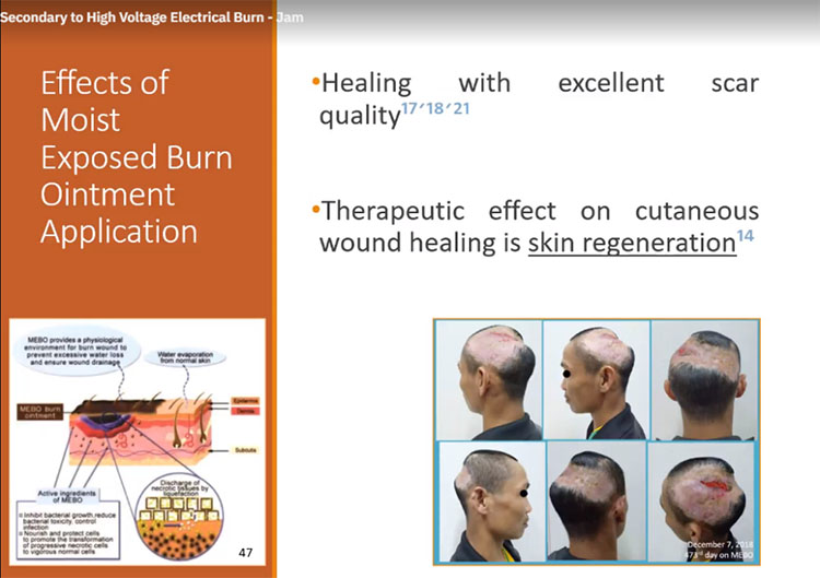 在口頭演講版塊,共有3名醫(yī)生帶來了針對濕潤燒傷膏的臨床應(yīng)用經(jīng)驗分享。首先,來自菲律賓達(dá)沃醫(yī)學(xué)中心的James Paul Dumdum醫(yī)生帶來了題為《濕潤燒傷膏用于治療高壓電燒傷導(dǎo)致的頭皮缺損》(Use of Moist Exposed Burn Ointment on a Scalp Defect Secondary to High Voltage Electrical Burn)的演講,他分享的是一例全層頭皮缺損患者應(yīng)用濕潤燒傷膏治療的完整過程。