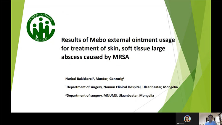另一位講者,是來自蒙古Nomun臨床醫(yī)院的Nurbol Bakhytkyeryei醫(yī)生,他的演講題目為《濕潤燒傷膏治療耐甲氧西林金黃色葡萄球菌感染膿腫》(Results of Moist Exposed Burn Ointment Usage for Treatment of Large Abscess Caused by MRSA)。在演講中,他分享了一例大面積感染壞死患者的治療,全程應(yīng)用濕潤暴露療法,創(chuàng)面愈合后未產(chǎn)生瘢痕,且肢體功能恢復(fù)良好。