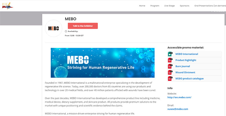 自2010年以來,美寶國際已經(jīng)連續(xù)參加了6屆ISBI大會,是ISBI最重要的合作伙伴之一。繼2016年和2018年連續(xù)2屆成為ISBI大會最高級別贊助商后,美寶國際今年再次成為ISBI大會的最大贊助商之一。此次大會上,美寶國際精心設(shè)計了電子展臺,力求從多方面向參會者展示企業(yè)風(fēng)采。展臺上不僅展示了濕潤燒傷膏、疤痕軟膏、創(chuàng)瘍貼等已在全球應(yīng)用數(shù)十年的核心產(chǎn)品,還同時與全球?qū)<曳窒砹藵駶櫉齻嘀委煙齻淖钚屡R床研究進(jìn)展。