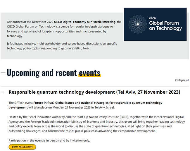 本次經(jīng)合組織全球技術(shù)論壇由以色列創(chuàng)新局和創(chuàng)業(yè)國家政策研究所(SNPI)、以色列國家數(shù)字機構(gòu)和以色列對外貿(mào)易管理局-經(jīng)濟和工業(yè)部共同主辦,將匯集領(lǐng)先的技術(shù)和政策專家,討論量子技術(shù)的現(xiàn)狀,突出其前景和問題,并考慮公共政策在促進其發(fā)展方面的重要作用。以色列、美國、丹麥、英國、奧地利、印度、日本、加拿大、巴塞羅那等國家和地區(qū)的科技部負責人、具有開創(chuàng)性的技術(shù)專家、國家政策研究中心或國家科學研究中心責任人、重要技術(shù)企業(yè)的CEO等將出席此次大會。