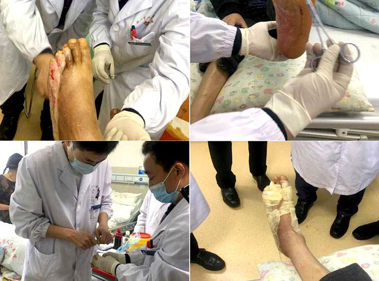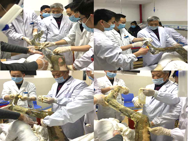 李主任陪同金教授與劉群峰醫(yī)生,張耀武醫(yī)生,鄭孟杰醫(yī)生,王帥醫(yī)生及于海洋醫(yī)生,共同會(huì)診了五位燒燙傷患者,一位雙足凍傷患者,一位疑似下肢栓塞并感染患者和一位丹毒患者。各位醫(yī)師在進(jìn)行再生醫(yī)療技術(shù)規(guī)范換藥過程中,積極同金教授探討技術(shù)要點(diǎn),如:怎樣探查壞死組織的深淺;創(chuàng)面壞死組織削除深淺及技巧等。當(dāng)大家會(huì)診到一位70%大面積燒傷高齡患者時(shí),在金教授和李主任的帶領(lǐng)下,科室全體總動(dòng)員,大家密切配合,規(guī)范操作,歷時(shí)近兩個(gè)小時(shí)完成創(chuàng)面治療!