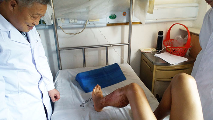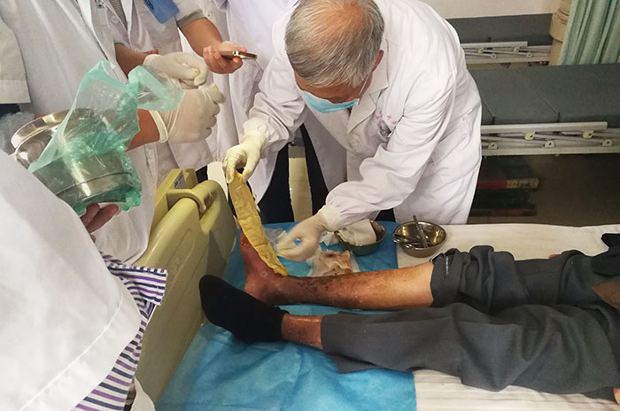 9月25日,中國中西醫(yī)結(jié)合學(xué)會燒傷專業(yè)委員會金黨軍教授來到黃岡市中心醫(yī)院腫瘤科,對該科骶尾部壓瘡患者進(jìn)會診,該科護(hù)士長尹志紅將患者情況與金教授進(jìn)行了交流,同時金教授對整個換藥流程進(jìn)行示范演示。換藥后金教授與護(hù)士長等人對再生技術(shù)進(jìn)行了更深入交流探討,為今后再生技術(shù)在該科室更好推廣奠定基礎(chǔ)。