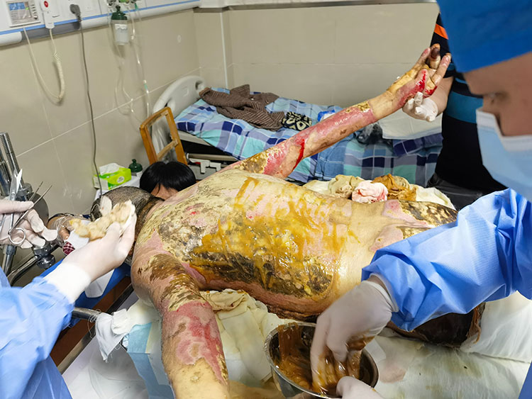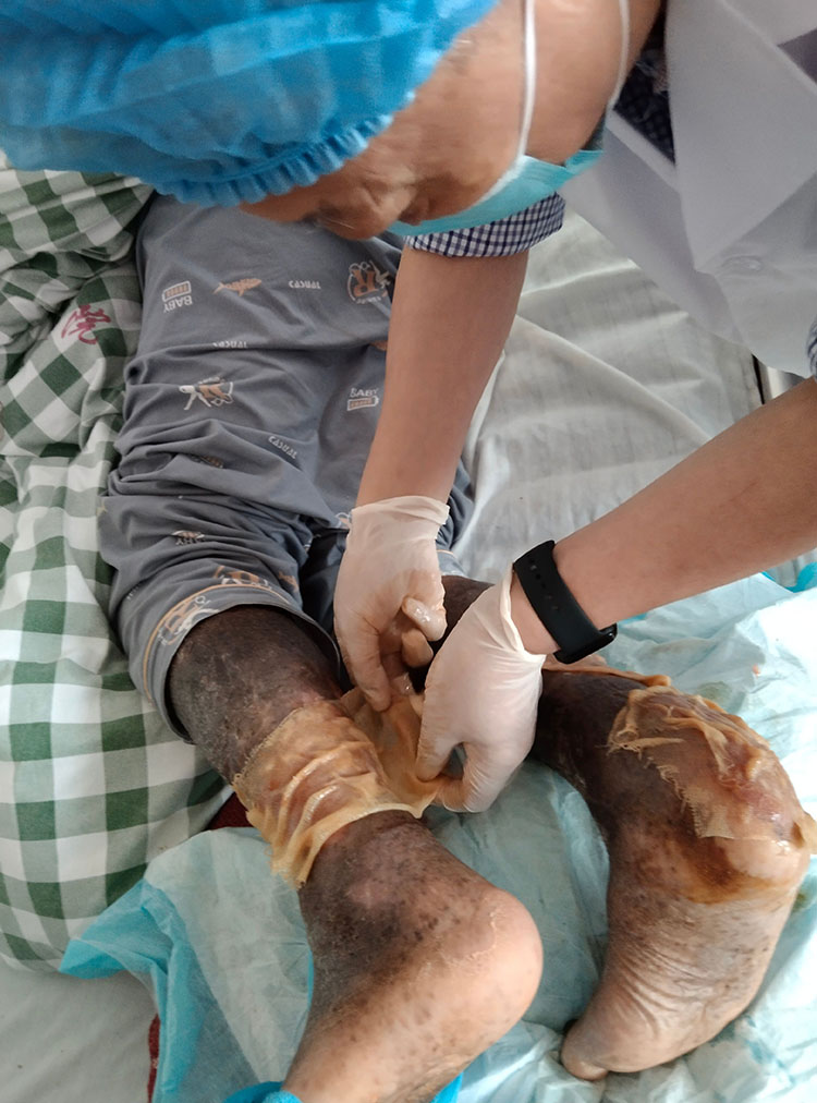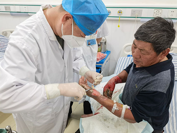 2023年5月22-23日,中國中西醫(yī)結(jié)合學(xué)會(huì)燒傷專業(yè)委員會(huì)醫(yī)療部張強(qiáng)主任應(yīng)邀前往寧國市人民醫(yī)院,會(huì)診了多例燒傷燙傷病人,對(duì)一例足部三度燙傷病人進(jìn)行剝痂清創(chuàng),示范再生醫(yī)療技術(shù)規(guī)范換藥及創(chuàng)面處理,和臨床醫(yī)生交流指導(dǎo),對(duì)不同創(chuàng)面的后期治療提出了寶貴意見。