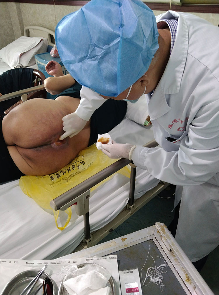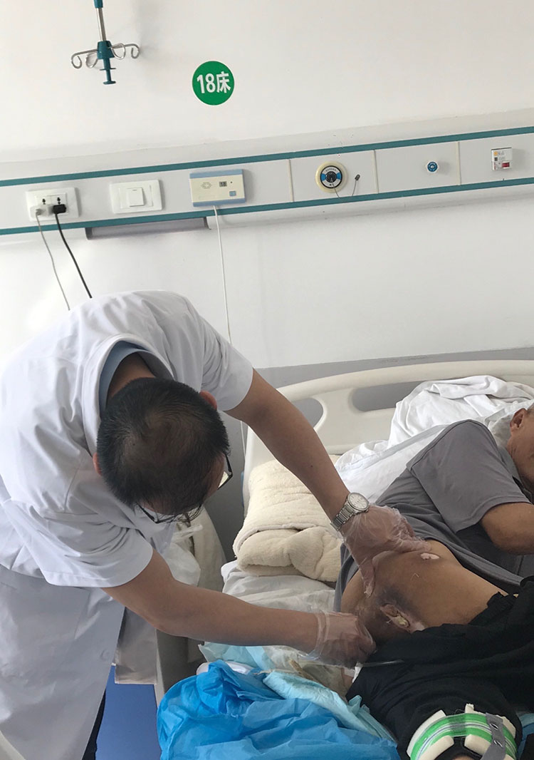 6月9日,北京榮祥再生醫(yī)學(xué)研究所副所長、《中國燒傷創(chuàng)瘍雜志》編委金黨軍以及林文忠來到鷹潭人民醫(yī)院,與院方彭文方及護(hù)士等,對(duì)一例壓瘡病人進(jìn)行巡診。