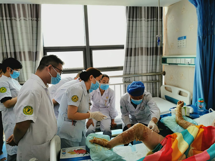 2023年4月20日,北京榮祥再生醫(yī)學(xué)研究所副所長(zhǎng)、《中國(guó)燒傷創(chuàng)瘍雜志》編委金黨軍應(yīng)江西贛州石城縣人民醫(yī)院泌外燒燒傷科李主任的邀請(qǐng),來到醫(yī)院會(huì)診一例大面積燒傷病人,并同陳醫(yī)生和黃醫(yī)生一起對(duì)大面積燒傷患者運(yùn)用再生醫(yī)療技術(shù)規(guī)范換藥且針對(duì)大面積燒傷患者的救治進(jìn)行了詳細(xì)的交流探討,獲得醫(yī)生和患者家屬的一致好評(píng)和認(rèn)可。下午應(yīng)寧都縣城北醫(yī)院曾院長(zhǎng)的邀請(qǐng),來到該院就再生醫(yī)療技術(shù)在臨床上各種慢性創(chuàng)面中的應(yīng)用進(jìn)行了全院的技術(shù)培訓(xùn)。