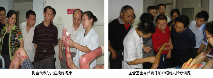 當(dāng)天上午,來(lái)自各地的51家醫(yī)療單位的100余名參會(huì)代表陸續(xù)到會(huì)簽到,會(huì)務(wù)組改變以往學(xué)員直接進(jìn)入會(huì)場(chǎng)的做法,而是按預(yù)定方案將報(bào)到學(xué)員分批帶到武警四川省消防總隊(duì)醫(yī)院燒傷整形科病房,對(duì)住院治療的28名患者逐一觀摩,并且分別由主管醫(yī)生介紹治療情況,同時(shí)回答學(xué)員提問(wèn)。