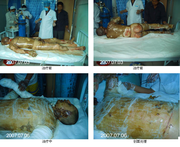 2007年7月1日該院又成功的救治一批特重度燒傷病人,共2人:患者,慕某:男:43,7月1 日7時:火焰燒傷2小時后入院,查:深Ⅱ゜25%,Ⅲ゜70%。TBSA95%。 合并重度吸入性損傷,會診后氣管切開,面積分布為頭面頸部,雙耳、軀干、雙手、雙上肢,軀干部,臀部,及雙下肢,雙踝燒傷,創(chuàng)面有大量小水皰,其中雙上肢,面頸部,創(chuàng)面蒼白,痛覺消失,鼻毛燒焦,鼻黏膜蒼白,聲音嘶啞。吸出黑色粘痰。診斷。1、特重度燒傷。2,吸入性損傷。 3,低血容量休克。中國燒傷創(chuàng)瘍研究所醫(yī)療部金黨軍主任于7月1日接到會診電話后及時趕到該院,在胡總多次電話指示下,同姜主任結(jié)合臨床危重病人的病情,制定出周密的治療方案:1、抗休克、2、抗感染、營養(yǎng)支持。3、創(chuàng)面全程應(yīng)MEBT/MEBO、4、氣管切開。5、霧化吸入4次/日。6、預(yù)防各種并發(fā)癥(對急性應(yīng)激性胃潰瘍作了及時處理,很快得到控制)。7、對深度創(chuàng)面進行耕耘,簿化相結(jié)合減張術(shù),充分發(fā)揮MEBO的藥理作用,創(chuàng)造生理性濕潤環(huán)境,挽救間生態(tài)組織,激活潛能再生細胞,通過無損傷地液化排除壞死組織,培植組織干細胞,實現(xiàn)組織器官的原位再生修復(fù),達到無瘢痕愈合。目前,患者病情穩(wěn)定正在治療中。