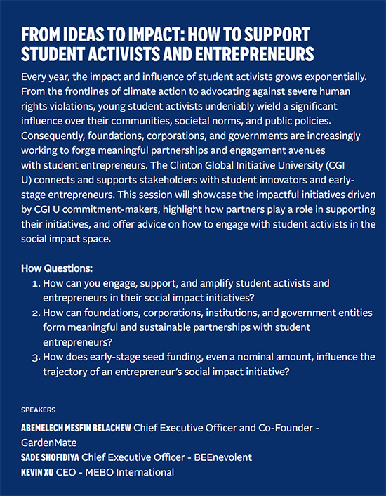 美寶集團(tuán)董事局主席徐鵬再度受邀出席并將于9月18日上午8點(diǎn)至8點(diǎn)30的焦點(diǎn)專(zhuān)題會(huì)議環(huán)節(jié)就“從想法到影響力:如何支持學(xué)生活動(dòng)家和企業(yè)家”進(jìn)行專(zhuān)題發(fā)言與答疑。作為最具影響力的CGI及CGI U倡議承諾者、發(fā)起者及推動(dòng)者,徐鵬將以自身大量實(shí)踐經(jīng)驗(yàn)為與會(huì)者特別是青年企業(yè)家及學(xué)生活動(dòng)家提供建議及策略,并強(qiáng)調(diào)如何通過(guò)合作伙伴支持在倡議方面發(fā)揮更多作用;徐鵬還將就如何參與、支持和擴(kuò)大學(xué)生活動(dòng)家和企業(yè)家的社會(huì)影響力,基金會(huì)、公司、機(jī)構(gòu)和政府實(shí)體如何與學(xué)生企業(yè)家建立有意義和可持續(xù)的伙伴關(guān)系以及如何增加企業(yè)家社會(huì)影響力等給予解答。同時(shí),作為APEC2023籌委會(huì)聯(lián)合主席,徐鵬還將以APEC中的青年力量為主題,激勵(lì)更多學(xué)子對(duì)世界發(fā)揮應(yīng)有的責(zé)任與擔(dān)當(dāng)。