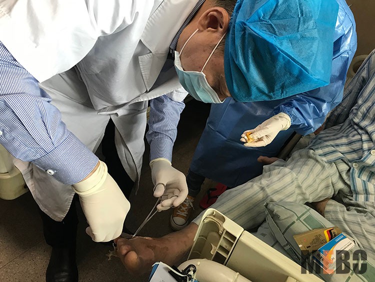 10月28日,北京榮祥再生醫(yī)學(xué)研究所副所長、中國中西醫(yī)結(jié)合學(xué)會(huì)燒傷專業(yè)委員會(huì)常務(wù)委員、《燒傷創(chuàng)瘍雜志》副總編輯、應(yīng)用燒傷創(chuàng)瘍?cè)偕t(yī)療技術(shù)治療糖尿病足領(lǐng)域?qū)<?、研究員王洪生教授應(yīng)邀來到佛山市南海區(qū)人民醫(yī)院燒傷整形科會(huì)診一例40%燒傷患者,并應(yīng)邀指導(dǎo)該科8例燒傷、糖足、大壓瘡患者換藥,臨床幫帶效果明顯。