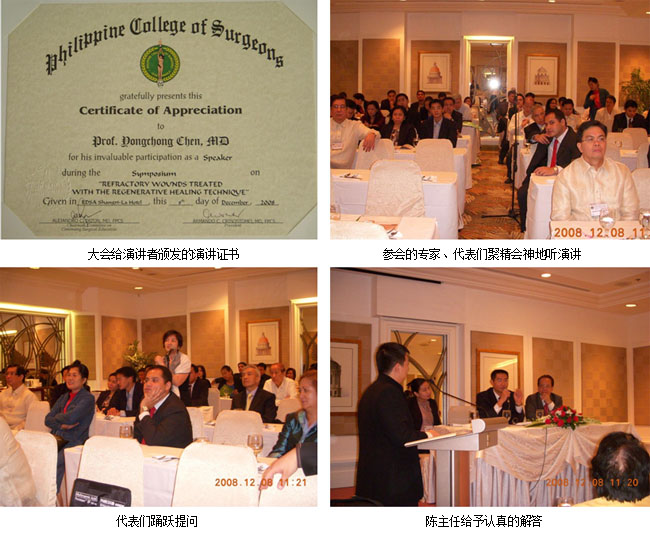 第64屆菲律賓外科醫(yī)師學(xué)會(huì)(Philippines College of Surgeons)學(xué)術(shù)年會(huì)于2008年12月8日至11日,在菲律賓首都馬尼拉市香格里拉酒店隆重召開(kāi)。菲律賓外科醫(yī)師學(xué)會(huì)的學(xué)術(shù)年會(huì)是每年召開(kāi)一次的全國(guó)性醫(yī)學(xué)大會(huì),會(huì)議涵蓋的學(xué)科有“普通外科專業(yè)”、“整形整容與重建外科專業(yè)”、“骨科創(chuàng)傷專業(yè)”等十二個(gè)專業(yè)和領(lǐng)域。參加大會(huì)的有來(lái)自全國(guó)20多個(gè)省、市的專家和學(xué)者1500多人,是每年全國(guó)外科醫(yī)師相聚一堂進(jìn)行學(xué)術(shù)交流的盛會(huì)。其中,參加本次“整形整容與重建外科專業(yè)”專題會(huì)議的專家代表有約90人。中國(guó)中西醫(yī)結(jié)合學(xué)會(huì)燒傷專業(yè)委員會(huì)委員、中國(guó)燒傷創(chuàng)瘍科技中心臨床部主任陳永翀應(yīng)邀出席本次大會(huì)并做專題演講。