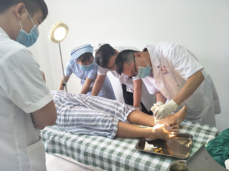 中午,應重慶市涪陵區(qū)皮膚病醫(yī)院院方邀請,王鄉(xiāng)寧主任又頂著酷暑來到該院,為靜脈曲張潰瘍及難愈性潰瘍患者會診并教授醫(yī)護人員規(guī)范使用再生醫(yī)療技術(shù)的要點、難點,得到院方一致好評。