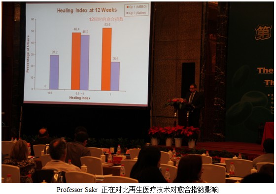 埃及亞歷山大大學醫(yī)學系外科教授、國際外科醫(yī)師學會會員Mahmoud F. Sakr 醫(yī)生也是一位再生醫(yī)療技術(shù)臨   床經(jīng)驗豐富的專家。他演講的題目為:濕潤燒傷膏在糖尿病足愈合過程中的作用。首先 Sakr 教授詳細的分析了糖尿病潰瘍發(fā)病的機理,分類以及常用治療方法。同時也指出,糖尿病患者潰瘍發(fā)病率居高不下的原因以及為何糖尿病潰瘍是醫(yī)生最棘手的問題之一。通常對于嚴重糖尿病足潰瘍患者而言,截肢往往是不得不選擇的保住性命的辦法。而再生醫(yī)療技術(shù)卻能夠在常規(guī)糖尿病治療前提下,治愈糖尿病潰瘍創(chuàng)面尤其是經(jīng)久不愈的糖尿病創(chuàng)面而避免截肢,很大程度上減少了患者截肢后帶來的生理與心里上的創(chuàng)傷。再生醫(yī)療技術(shù)不僅僅能夠明顯減小潰瘍表面積同時也縮短了創(chuàng)面愈合時間。是治療糖尿病足的不二之選。
