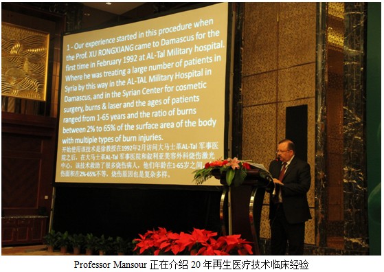 來自敘利亞整形修復(fù)外科中心主任醫(yī)學博士、整形修復(fù)外科醫(yī)生Adham MANSOUR醫(yī)生與1992年開始接觸再生醫(yī)療技術(shù),至今已經(jīng)有20余年再生醫(yī)療技術(shù)臨床經(jīng)驗。自從1992徐教授到敘利亞訪問后,Dr. Mansour 就對再生醫(yī)療技術(shù)產(chǎn)生了濃厚的興趣并開始嘗試使用該技術(shù)治療燒傷病人。在成功救治了無數(shù)不同面積類型燒傷患者后,他又大膽嘗試將該技術(shù)應(yīng)用于其他創(chuàng)面。經(jīng)過20多年的臨床應(yīng)用,他已經(jīng)成功的將再生醫(yī)療技術(shù)應(yīng)用于各類型燒傷創(chuàng)面,激光美容創(chuàng)面,整形創(chuàng)面等并通過大量鮮明的治療前后對比照片展示了再生醫(yī)療技術(shù)的優(yōu)越性,現(xiàn)場代表無不折服。