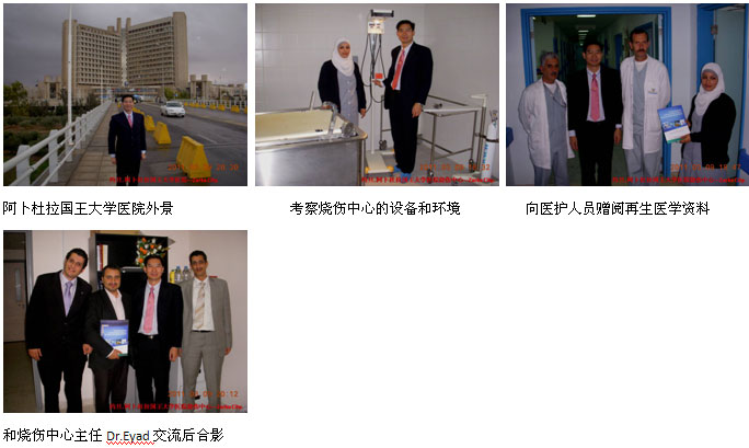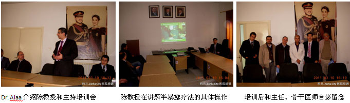 3、 2011年3月10日上午,陳教授一行應(yīng)邀來到了的Zarka市Zarka Hospital的外科病房進行學(xué)術(shù)交流及再生醫(yī)學(xué)技術(shù)培訓(xùn)。Zarka Hospital是當?shù)刈畲蟮木C合醫(yī)院,該院在臨床上使用MEBO治療小面積燒傷和慢性潰瘍創(chuàng)面已經(jīng)有8年多的經(jīng)驗,但是在大面積燒傷的救治上還沒有突破。主任和醫(yī)護人員對陳教授的到來表示熱情歡迎,詢問了大家在臨床中使用MEBO的情況、存在的問題和進行簡單的討論后,為了使大家能夠更全面、更系統(tǒng)地掌握燒傷再生醫(yī)學(xué)技術(shù),陳教授隨后用1小時的時間給該院的10名外科醫(yī)師進行了燒傷再生醫(yī)學(xué)技術(shù)臨床規(guī)范應(yīng)用的培訓(xùn),培訓(xùn)使大家更多地了解了再生醫(yī)學(xué)技術(shù)在大面積燒傷和各種嚴重創(chuàng)瘍創(chuàng)面的治療效果和具體的創(chuàng)面治療方法,增強了大家以后使用再生醫(yī)學(xué)技術(shù)治療中等面積和大面積燒傷的信心。