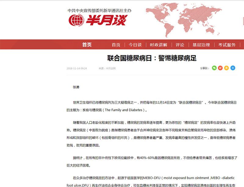 2018年11月14日,聯(lián)合國糖尿病日,中央級新聞媒體“半月談”在其網(wǎng)站健康欄目首頁刊發(fā)中國中西醫(yī)結(jié)合學會燒傷專委會常務(wù)委員、《中國燒傷創(chuàng)瘍》雜志編輯委員會常務(wù)委員張勇撰寫的“聯(lián)合國糖尿病日:警惕糖尿病足”一文。
