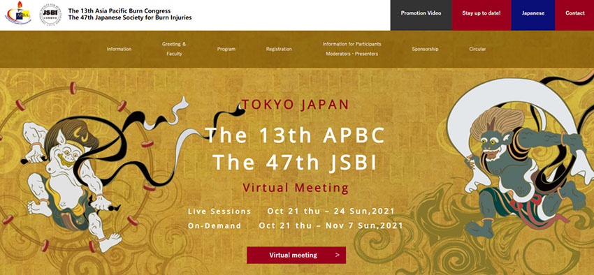 2021年10月21日至10月24日,第13屆亞太燒傷會議(APBC 2021)暨日本燒傷學(xué)會(JSBI)第47屆年會以虛擬會議的形式舉行。亞太燒傷會議是國際燒傷會議日歷上的一項重要活動,它匯聚了來自各國的醫(yī)生、護士及科研人員等,為全球醫(yī)務(wù)工作者分享臨床治療經(jīng)驗、最新研究成果和臨床管理方法提供了一個寶貴的平臺。本屆大會的主題為“燒傷治療的下一次動態(tài)變化——應(yīng)對感染、預(yù)防和控制感染”(The Next Dynamic Change in Burn Care – Coping with Infection, Infection Prevention and Control)。
