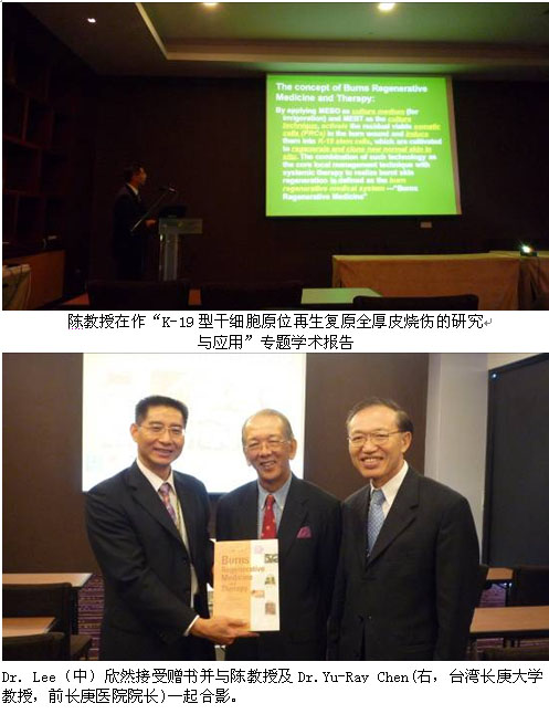 Dr. Lee在聽(tīng)完陳教授的報(bào)告后激動(dòng)的說(shuō):“我們新加坡總醫(yī)院20年前完成了國(guó)際上第個(gè)MEBO的臨床實(shí)驗(yàn),當(dāng)時(shí)的100多例在臨床上取得了與其它方法一樣滿意的效果,我們當(dāng)時(shí)知道美寶會(huì)有神奇的效果,但不知道其原因是什么,現(xiàn)在聽(tīng)了你的報(bào)告,這是干細(xì)胞原位再生的結(jié)果!這是很令人振奮的!我對(duì)你們K19的實(shí)驗(yàn)很感興趣,如果除了免疫熒光外,還有其它的實(shí)驗(yàn)數(shù)據(jù)就更好了,希望美寶發(fā)展的更好!”他在會(huì)后欣然接受了陳教授所贈(zèng)徐榮祥教授的專著B(niǎo)urns Regenerative Medicine and Therapy. 并表示希望能與美寶有更好地合作,也請(qǐng)美寶團(tuán)隊(duì)轉(zhuǎn)達(dá)對(duì)徐榮祥教授的誠(chéng)摯問(wèn)候!