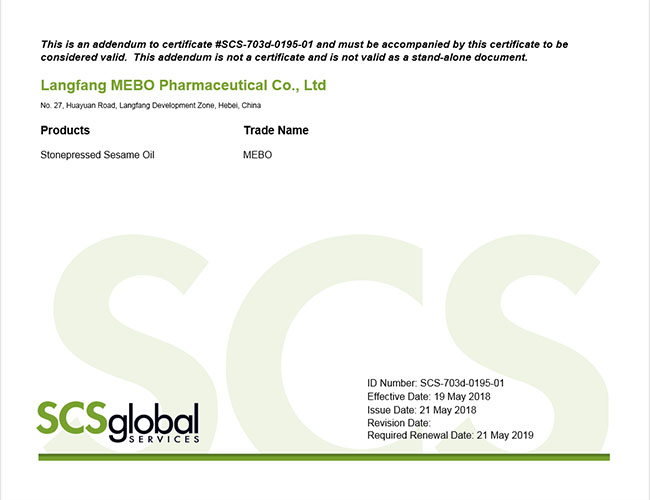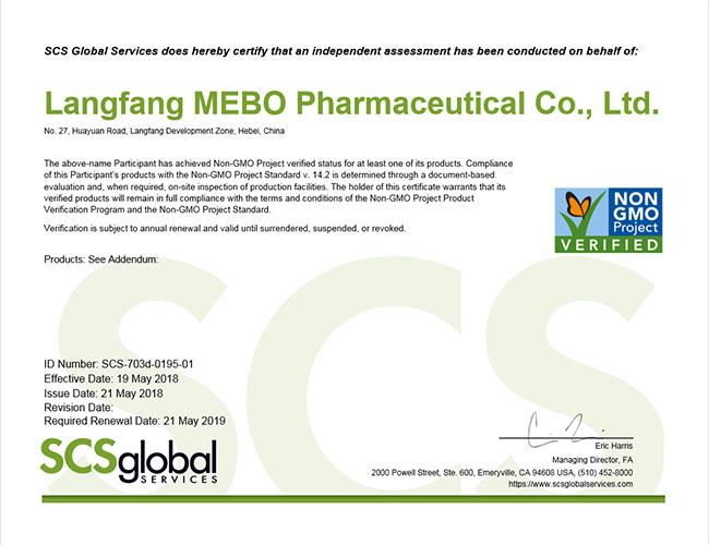 2018年5月21日,經(jīng)國際知名第三方認(rèn)證公司SCS Global Services承辦,美寶廊坊基地通過非轉(zhuǎn)基因項(xiàng)目認(rèn)證。