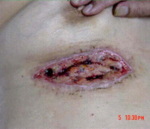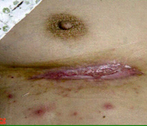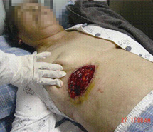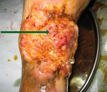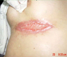 將菜花樣的腫瘤組織用手術(shù)刀削除,削到真皮下層于皮下組織交界處,而后先用美寶燒傷膏包扎,而后采用濕潤(rùn)暴露療法。
